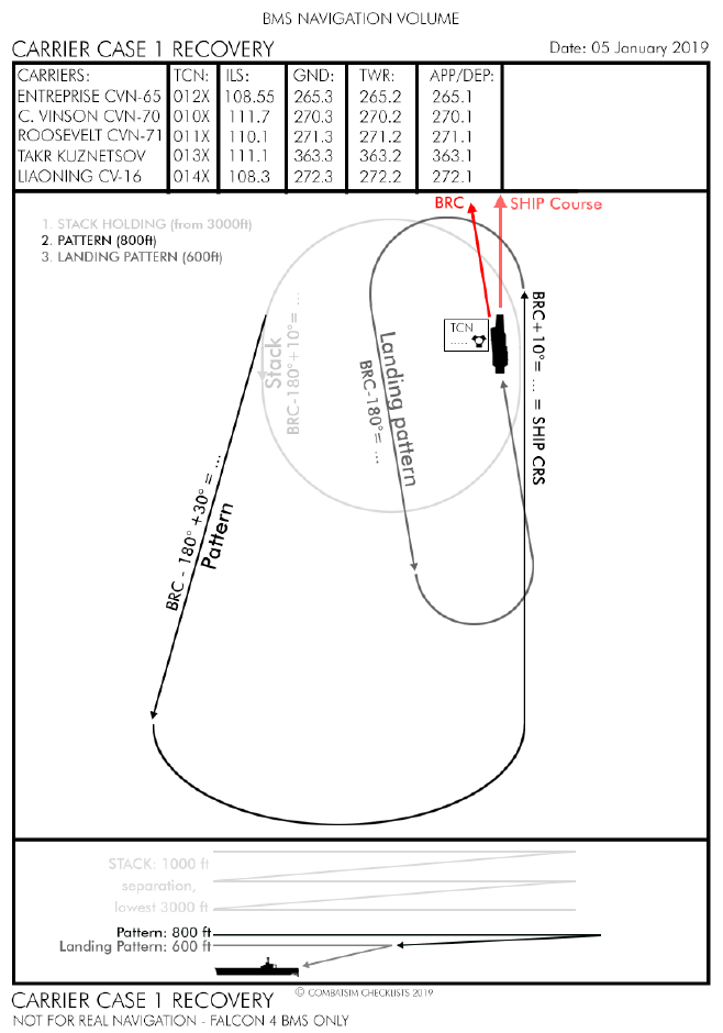 Un porte-avions dans Falcon BMS fonctionne de manière très similaire à une base aérienne terrestre. Lors du décollage et lors de votre retour, vous devez synthoniser les fréquences indiquées ici ou se servir des "Presets 2, 3 et 4" UHF via COM1, sans quoi, l'ATC ne pourra pas vous répondre.